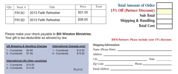 Please make your check payable to Bill Winston Ministries. Your gift is tax deductible as allowed by law. Contact a Bill Winston Ministry Representative at (800) 711-9327 if you need further assistance.